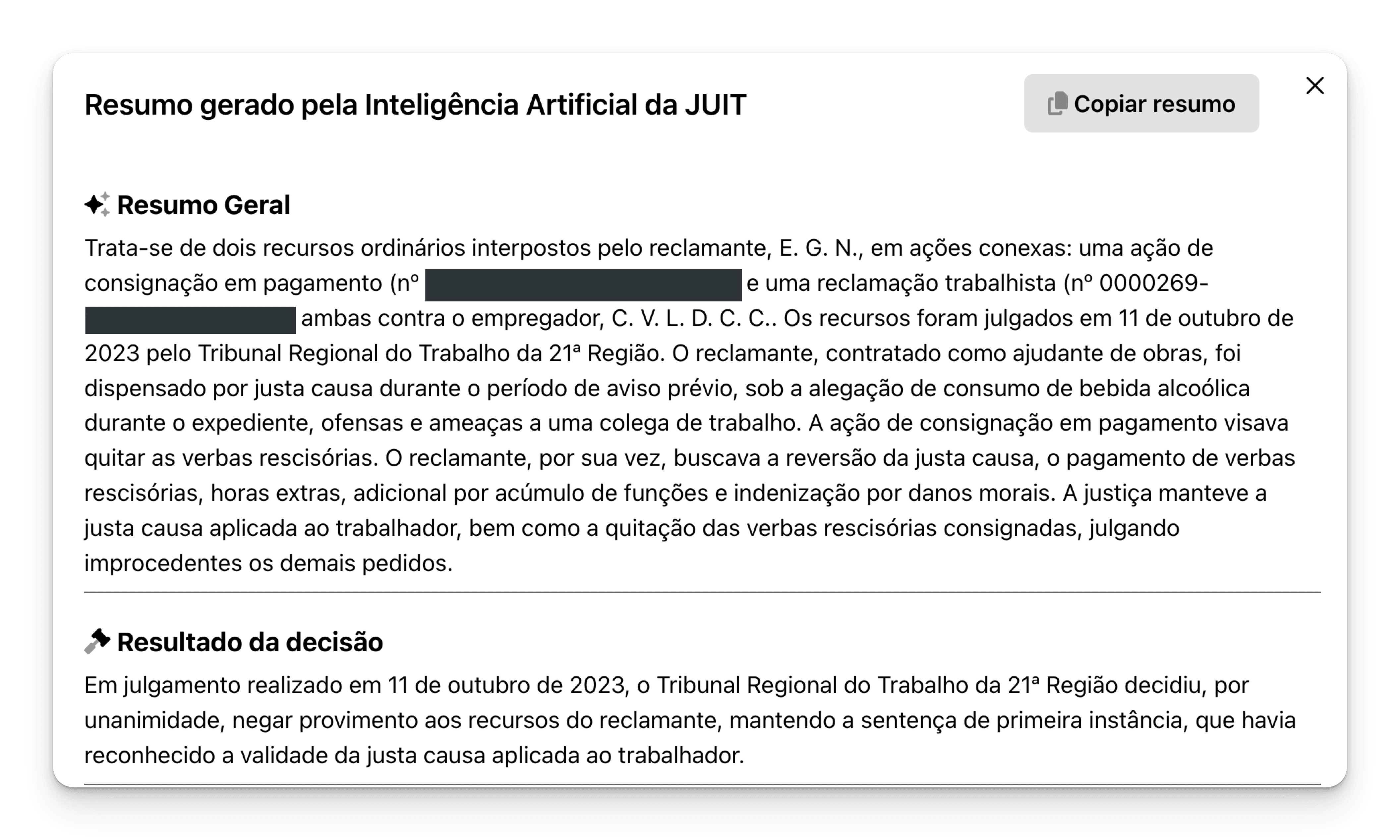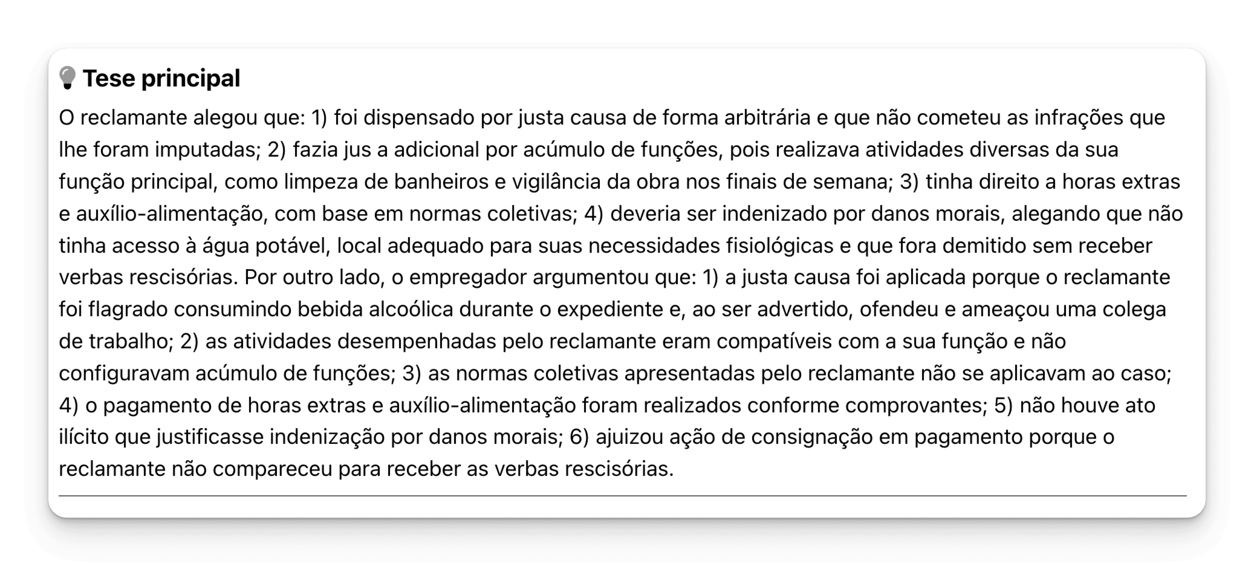 Acesse as informações mais relevantes de um julgado em poucos segundos, com o resumo gerado pelo BarbosinhIA. Economize tempo e trabalho da sua equipe.